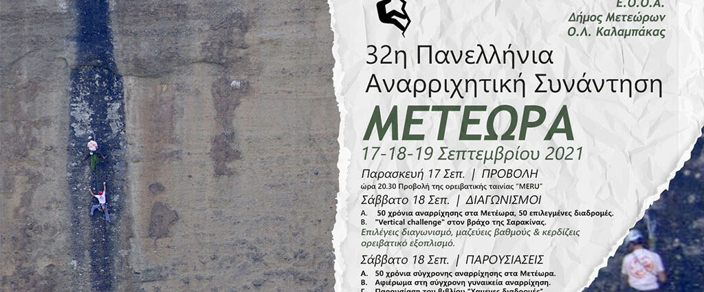 H Πανελλήνια Αναρριχητική Συνάντηση θα πραγματοποιηθεί στα Μετέωρα από 17-19/9/2021, από την Ελληνική Ομοσπονδία Ορειβασίας Αναρρίχησης σε συνεργασία με το Δήμο Καλαμπάκας και την Ο.Λ Καλαμπάκας.